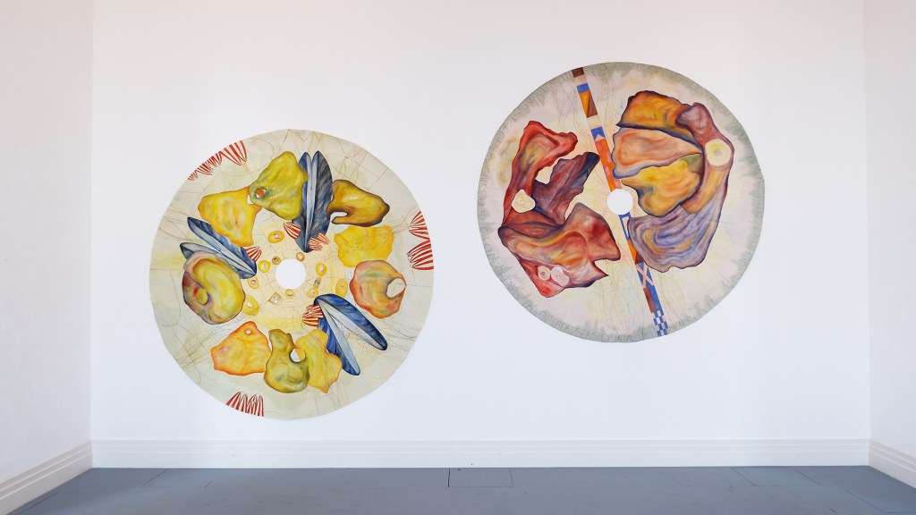 “Bivalvia Capas,” gouache and shells on canvas, 246 x 246 cm, Martin Gropius Bau, installation view 2021