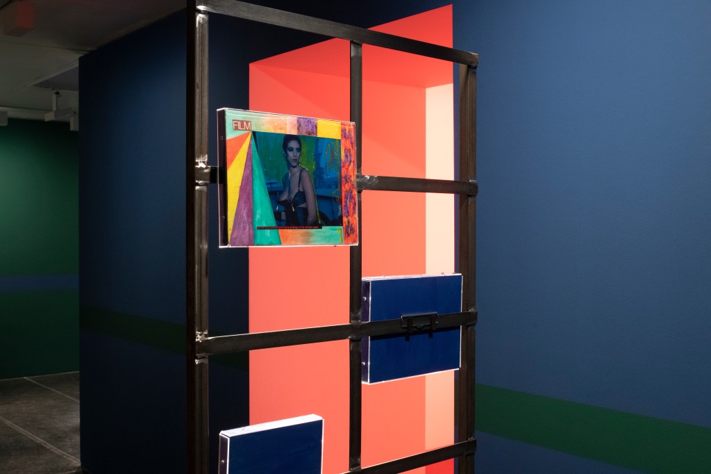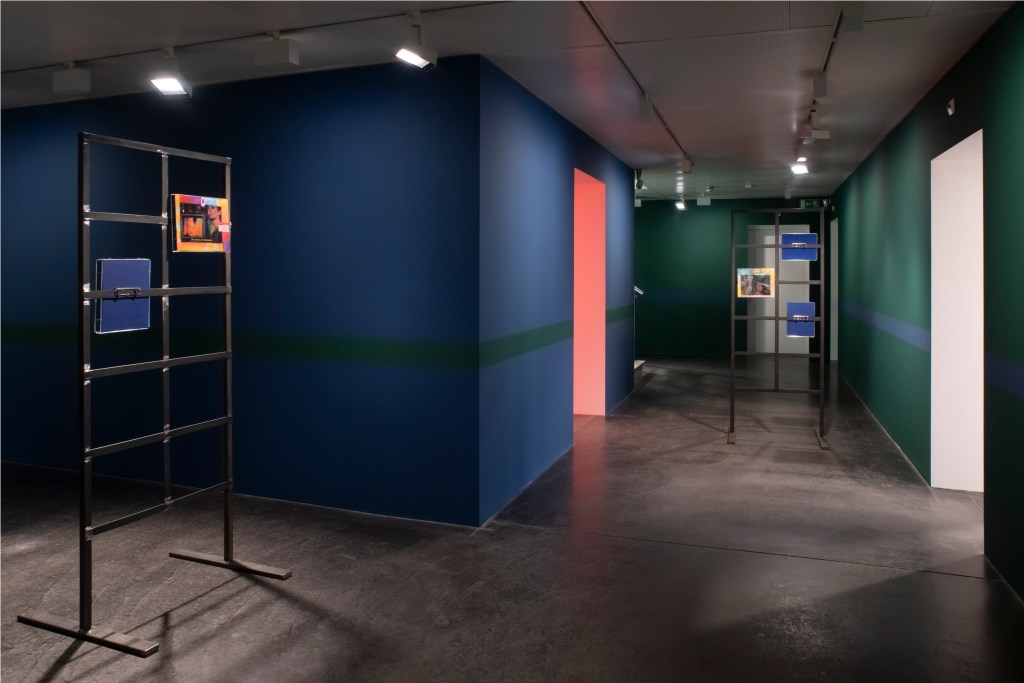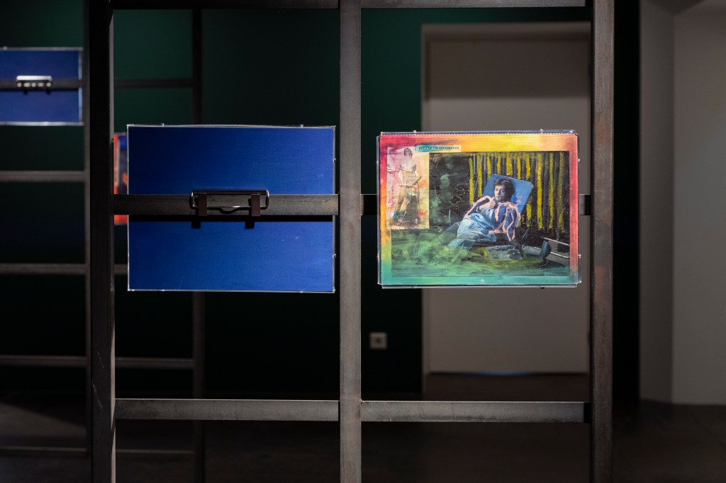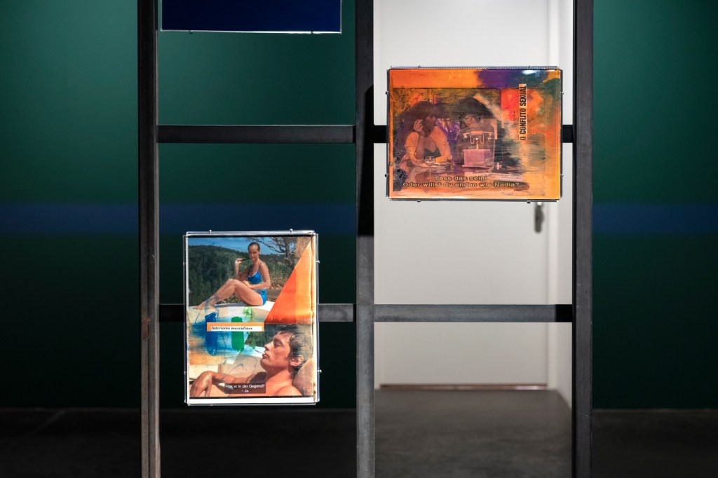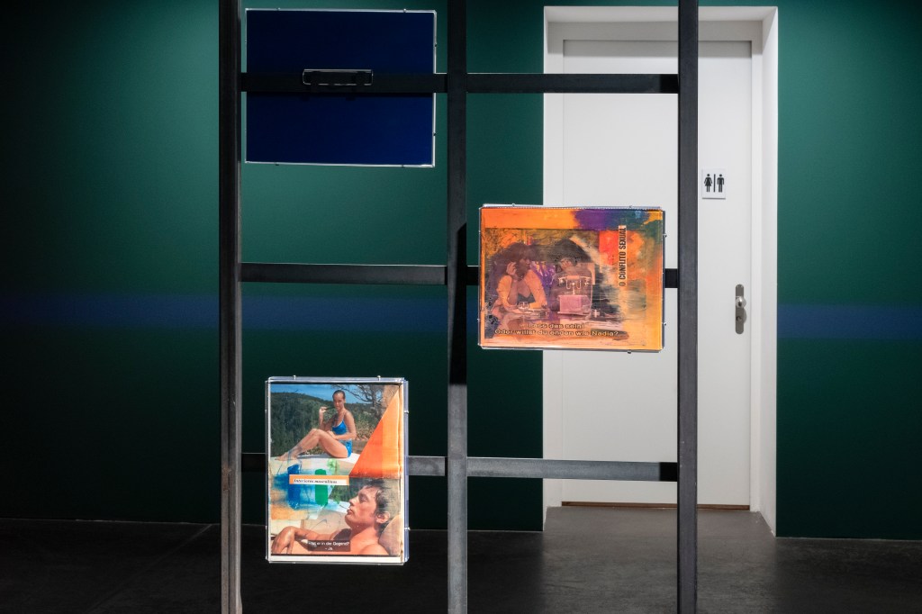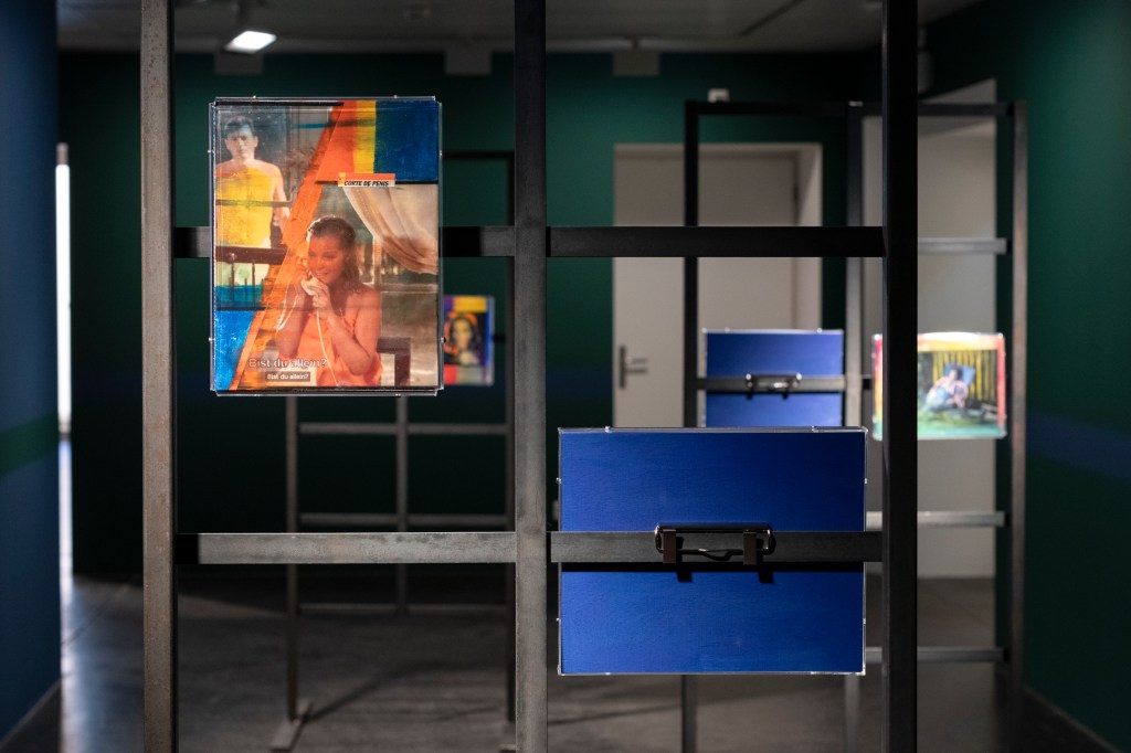 The book covers are juxtaposed with collages on metal stands entitled Obsessions (2022-2023), which examine (queer) desire in cinema. The artist edited and commented on film stills from cult films from the 1960s to 1980s such as La Piscine (1969), Diva (1981) and The Cruel Woman (1985). Obsessions is both a critical examination of the cinematographic representation of desire, which is characterized by the male gaze, and a homage to the female actors and directors of the time.