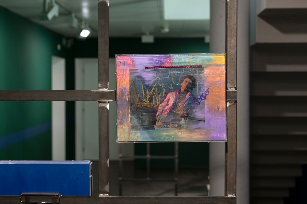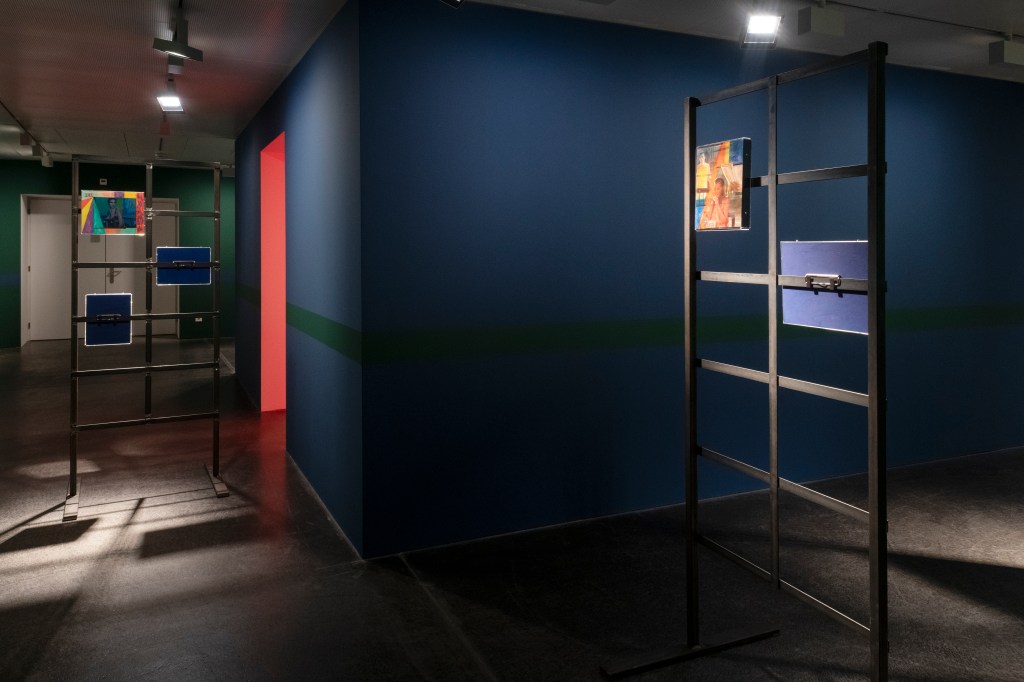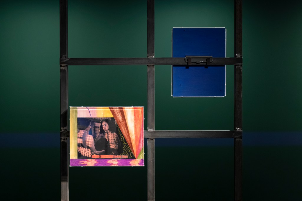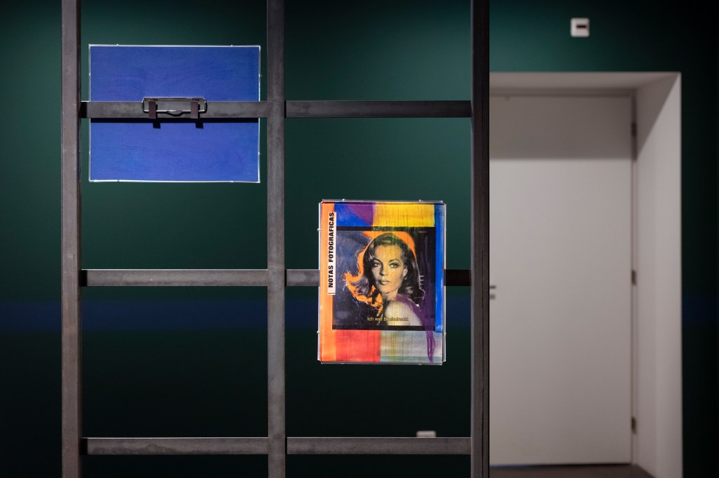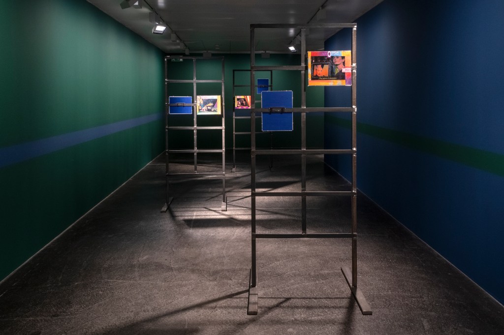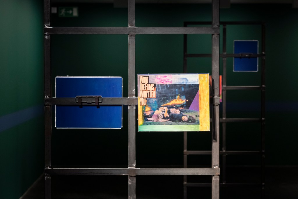 The book covers are juxtaposed with collages on metal stands entitled Obsessions (2022-2023), which examine (queer) desire in cinema. The artist edited and commented on film stills from cult films from the 1960s to 1980s such as La Piscine (1969), Diva (1981) and The Cruel Woman (1985). Obsessions is both a critical examination of the cinematographic representation of desire, which is characterized by the male gaze, and a homage to the female actors and directors of the time.