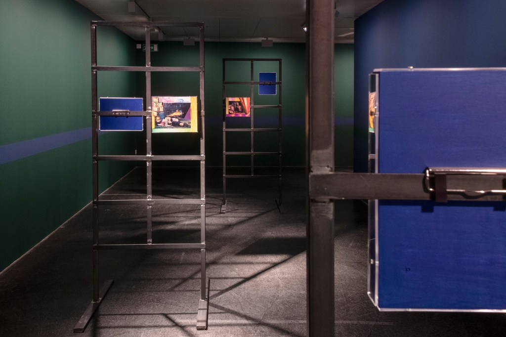 Exhibition views: THE CRUEL WOMAN, collages on steal frames, wall painting, Coalmine Winterthur, 2024.