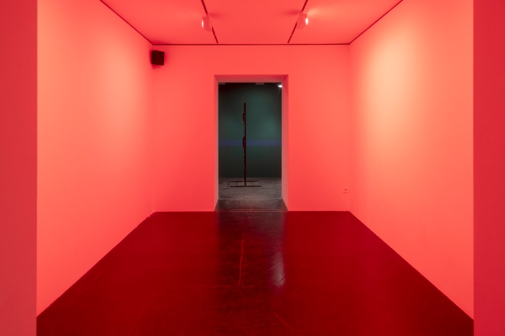 The interplay of gestures, glances and comments is enhanced by a woman’s voice that emerges from the red-lit cabinet. It is the voice of the renowned Swiss actress Esther Gemsch, who performs a sharp-tongued monologue by Nadja Abt as The Cruel Woman. The text interweaves quotes from Heinrich von Kleist’s Penthesilea (1808), Sports Play (1998) by Elfriede Jelinek and Lisa Robertson’s Proverbs of a She-Dandy (2017) with the artist’s own reflections on the agency of women, capital and sinister machinations to create a 6-minute thriller.