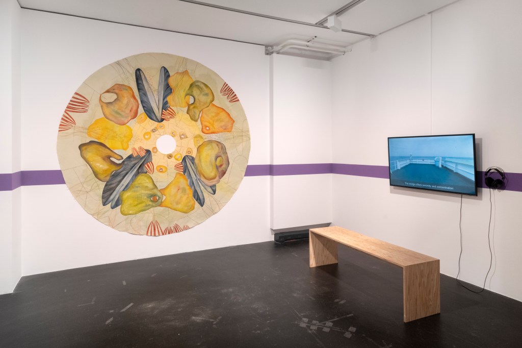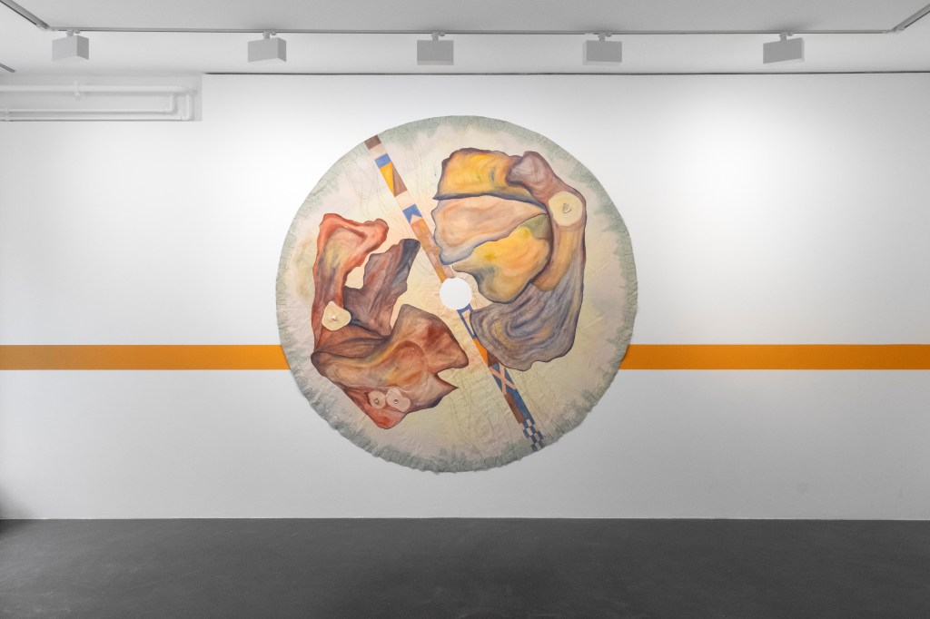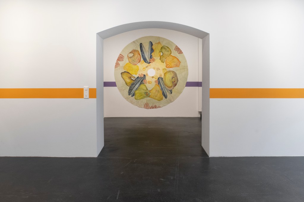Exhibition views: THE CRUEL WOMAN, „Bivalvia“ paintings on canvas, gouache paintings on paper, wall painting, Coalmine Winterthur, 2024.
